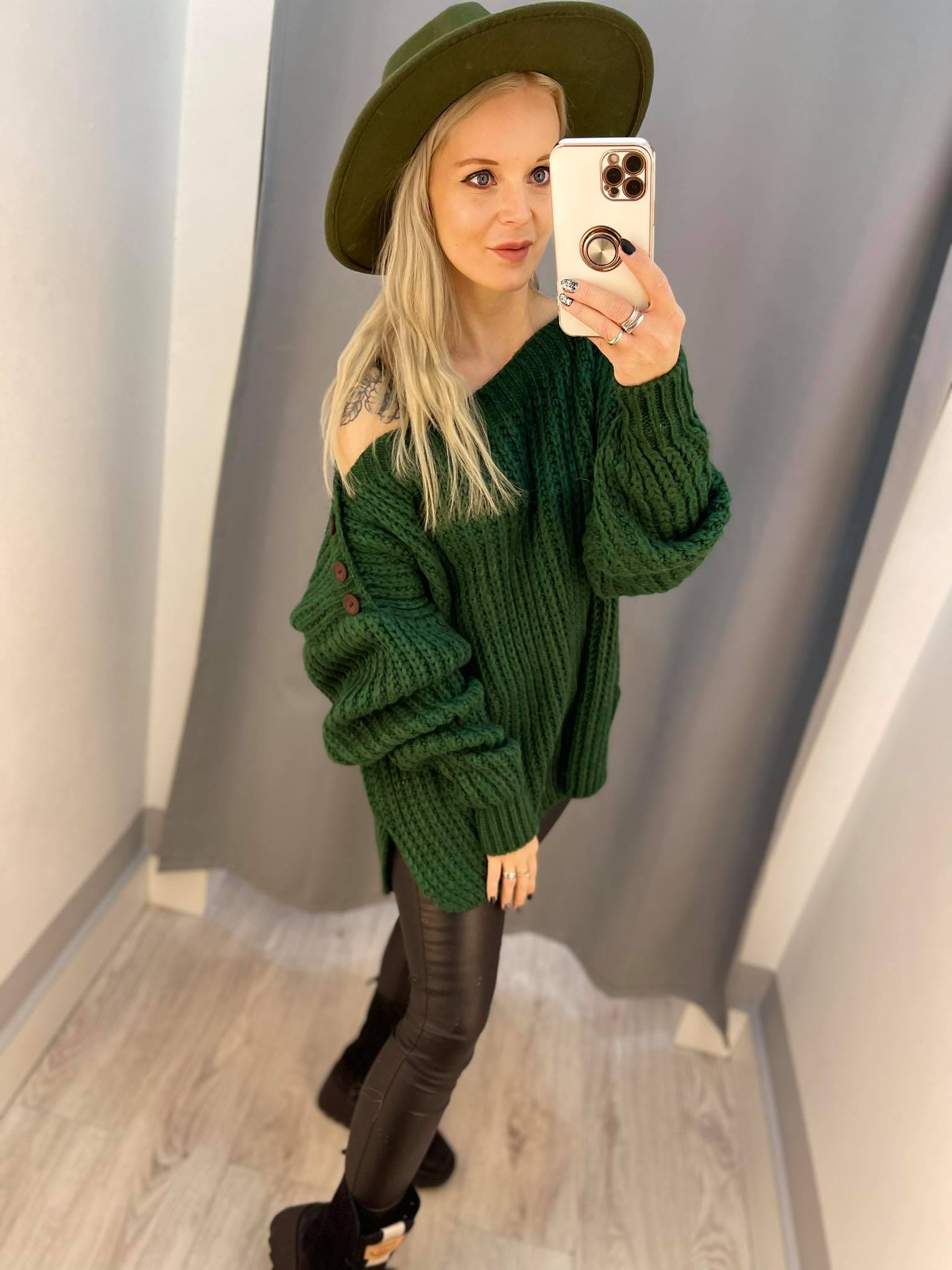 BY O LA LA.. ! OVERSIZOWY SWETER Z GUZIKAMI ZIELONY