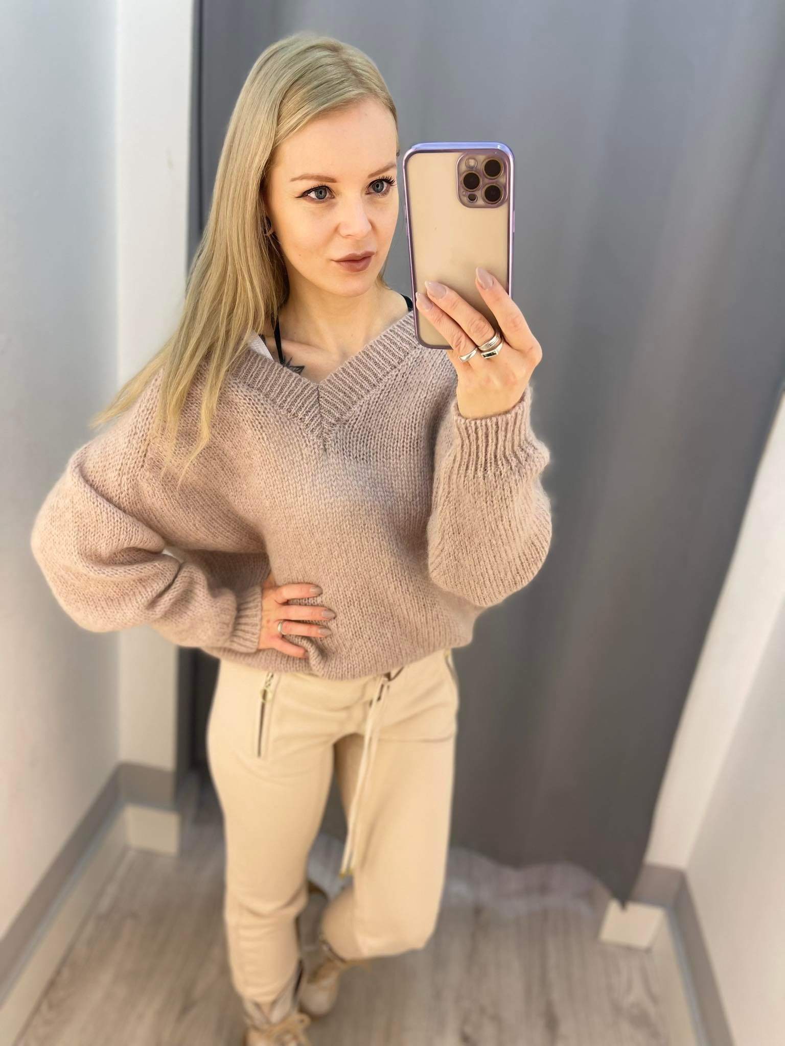 BY O LA LA.. ! OVERSIZOWY SWETER V-NECK CHŁODNY BEŻ