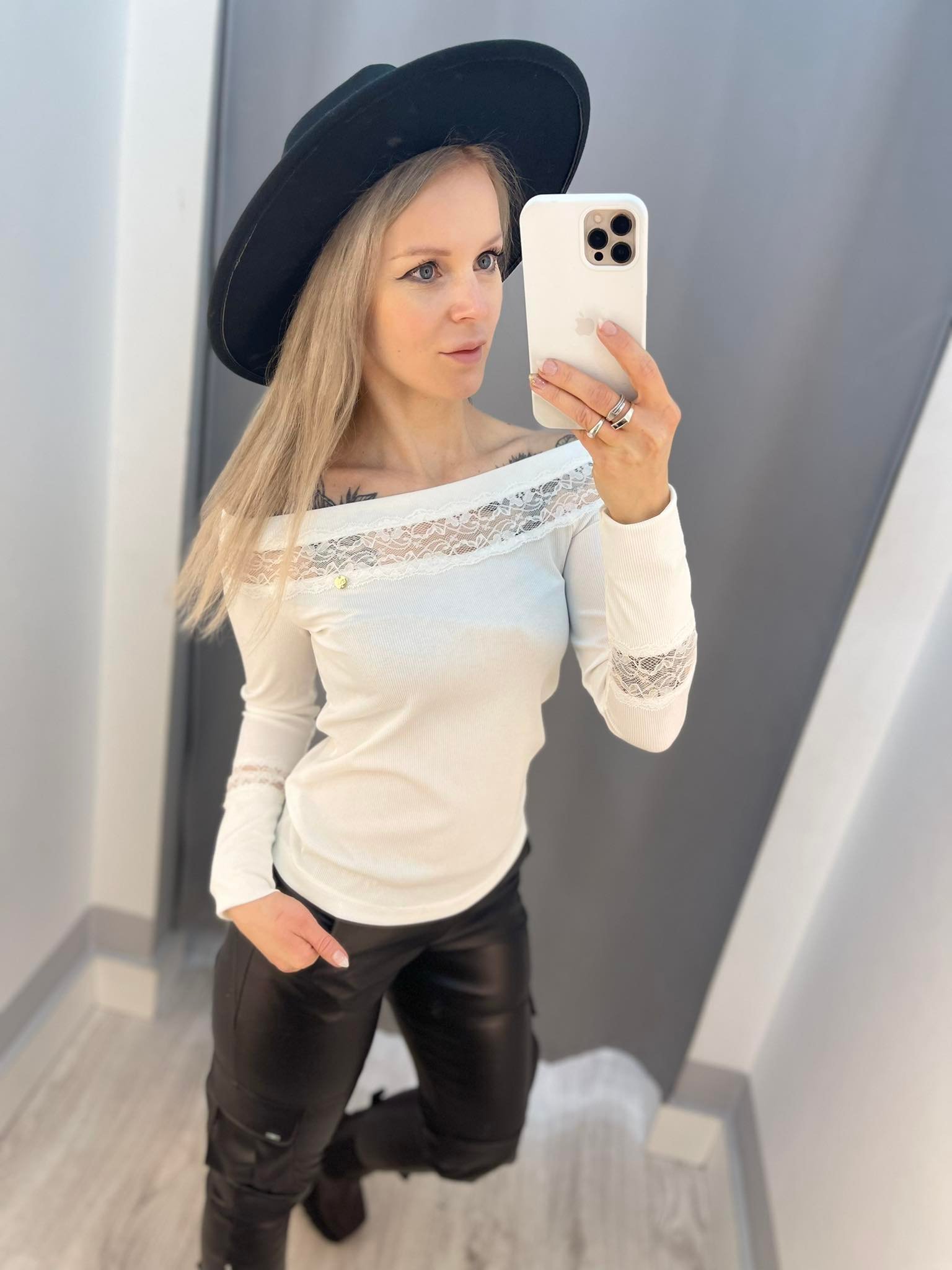 BY O LA LA...! PRĄŻKOWANA BLUZKA Z KORONKĄ BIAŁA