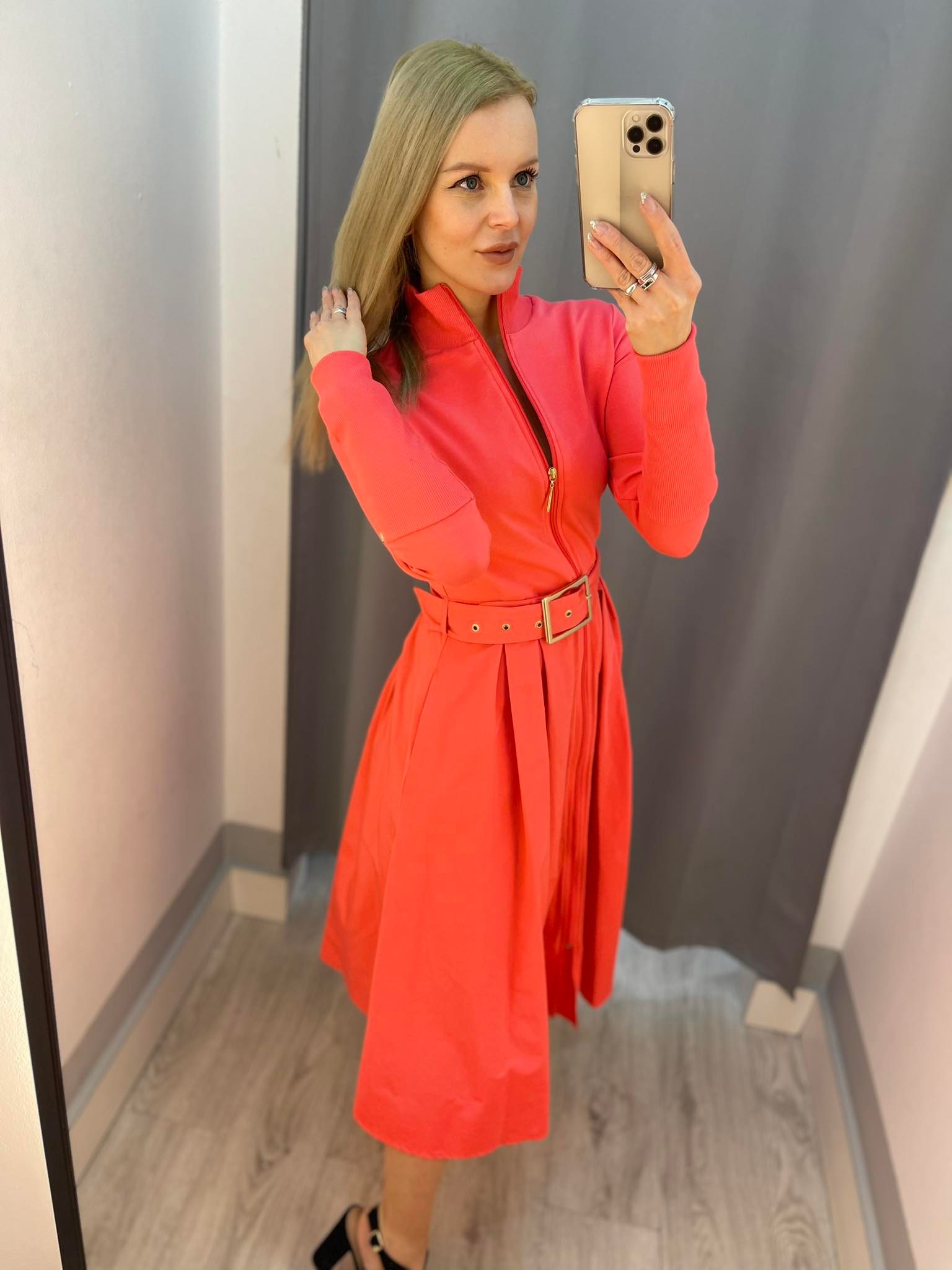 BY O LA LA! ROZKLOSZOWANA SUKIENKA MIDI Z PASKIEM MALINA