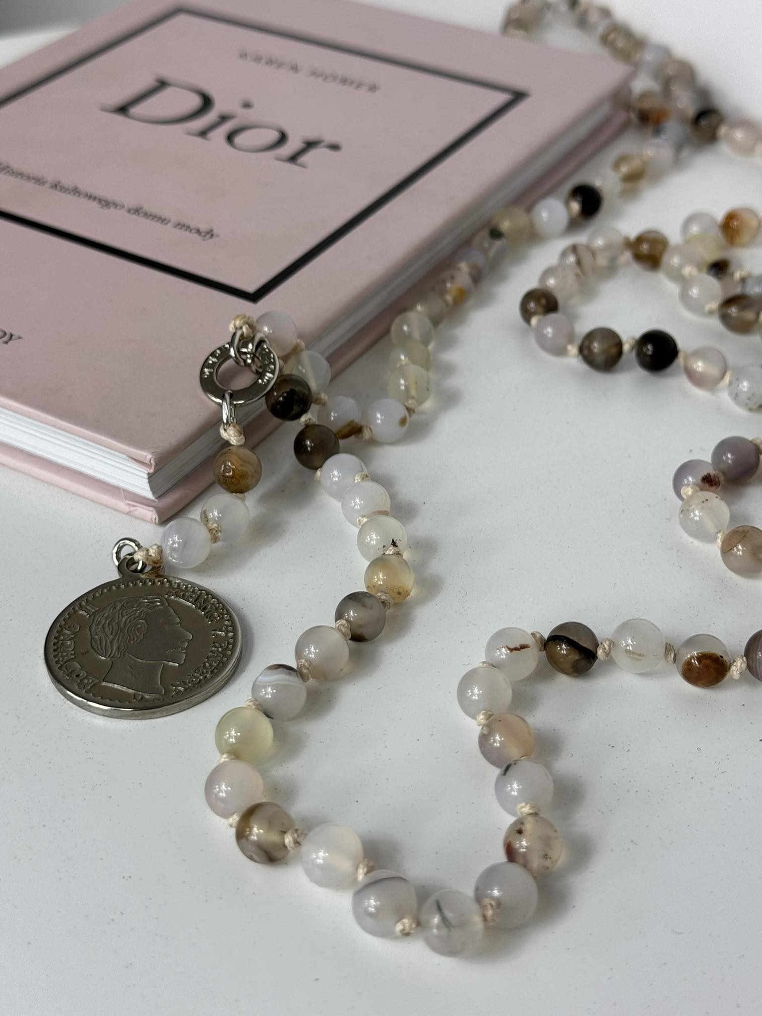 BY O LA LA ! WISIOR NASZYJNIK AGAT Z MONETAMI BEŻ/SREBRO