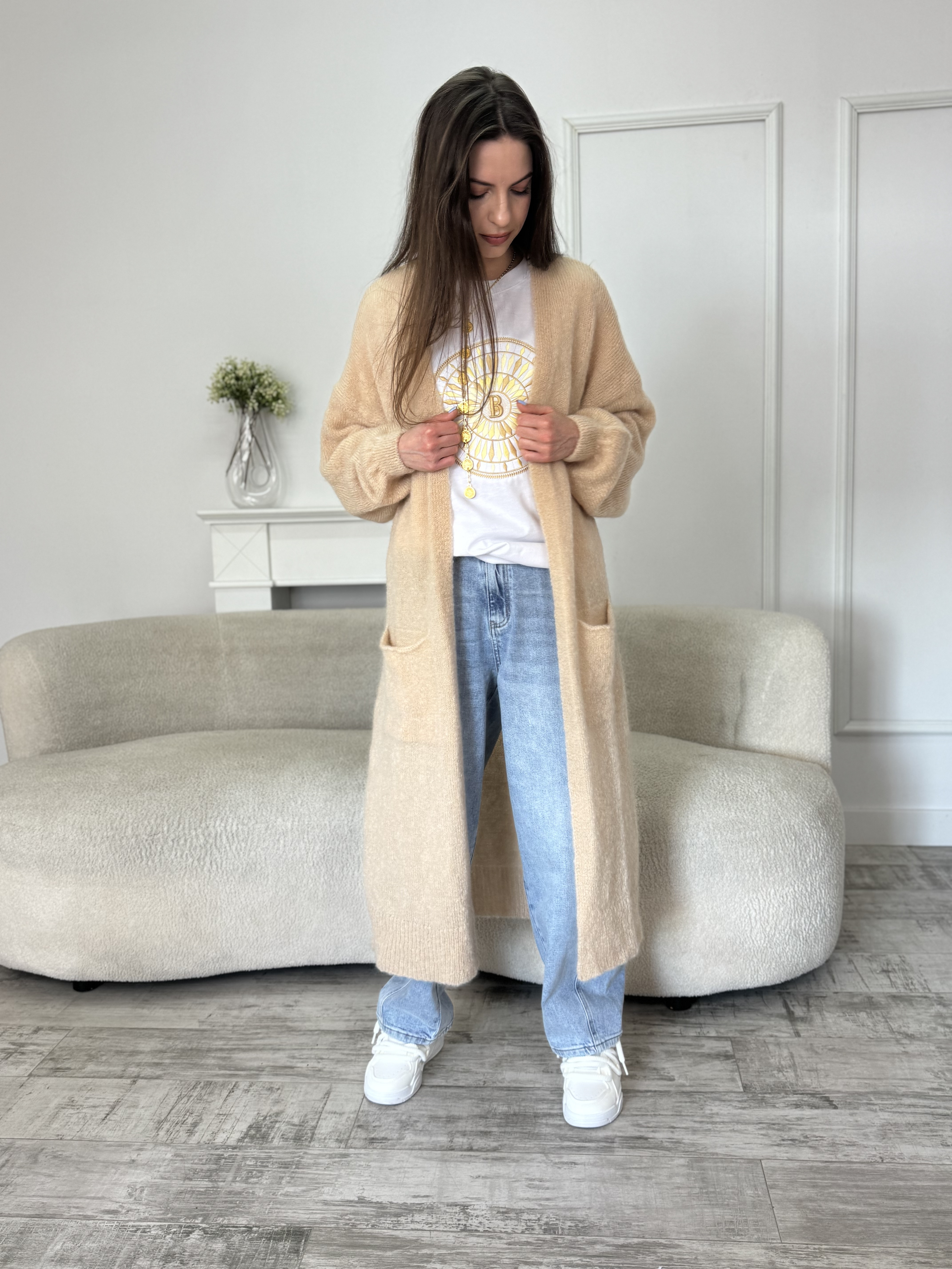 BY O LA LA...! DŁUGI SWETER KARDIGAN Z KIESZENIAMI CIEPŁY BEŻ