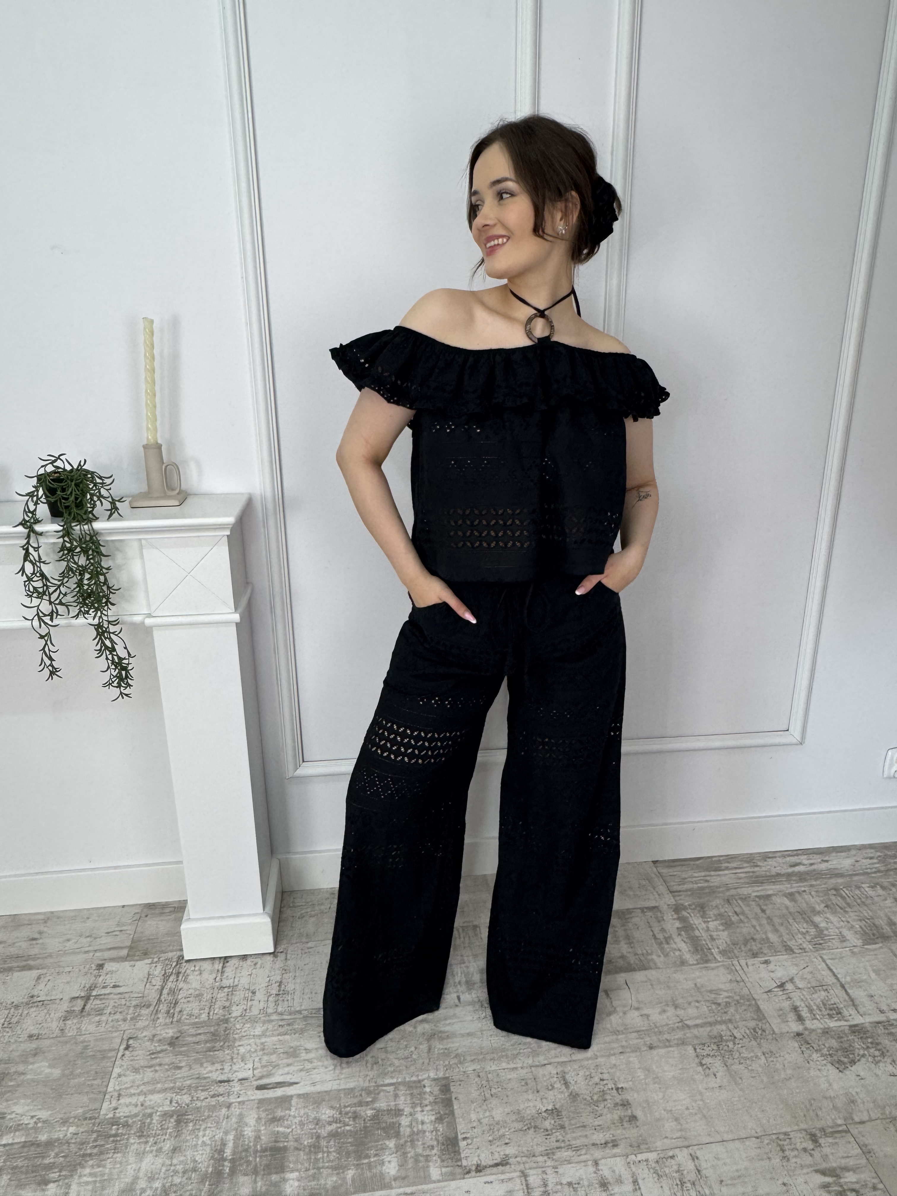 BY O LA LA...! KOMPLET BLUZKA HISZPANKA + SPODNIE HAFT ANGIELSKI CZERŃ