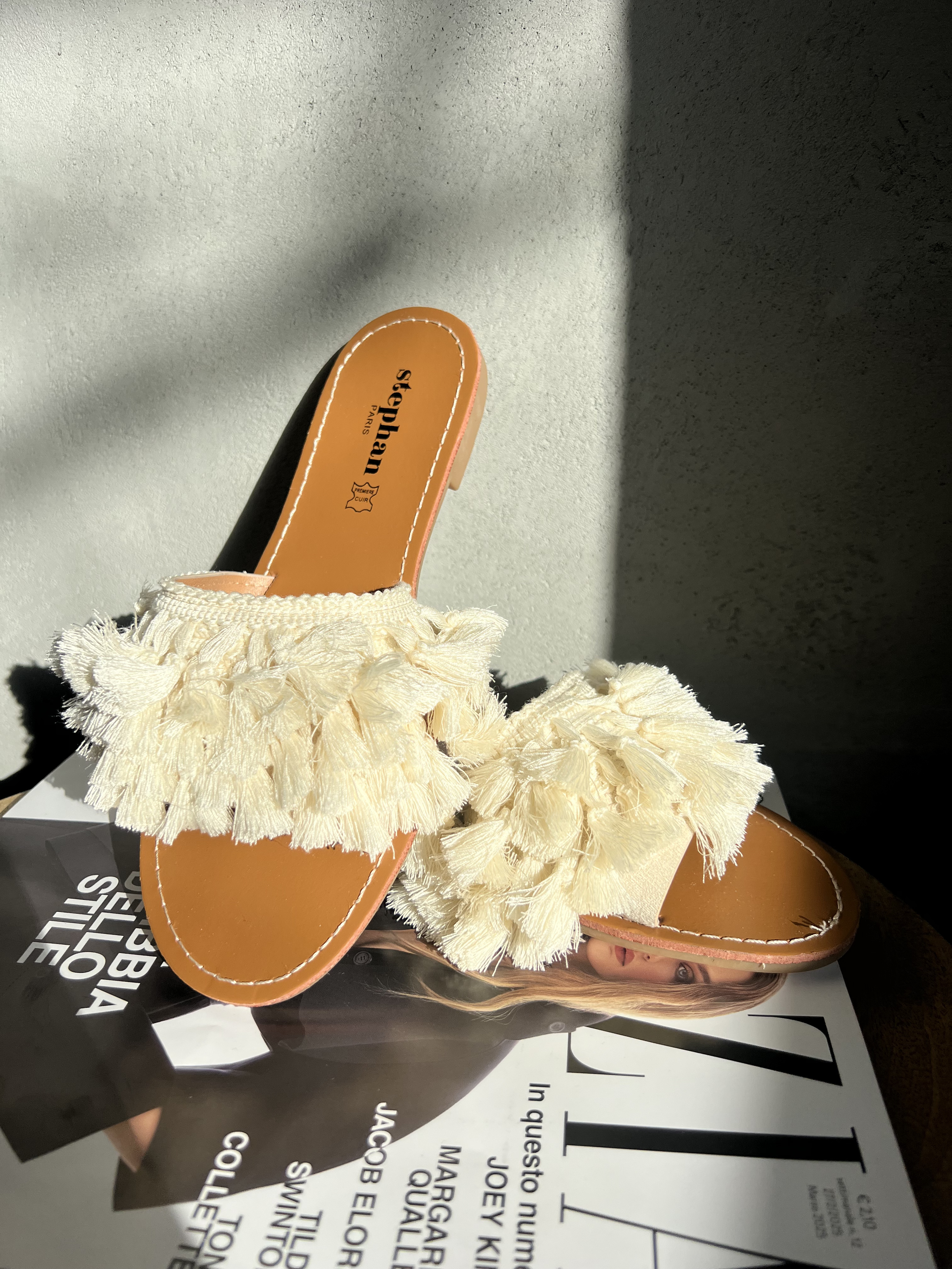 STEPHAN BUTY KLAPKI Z CHWOSTAMI ŚMIETANA