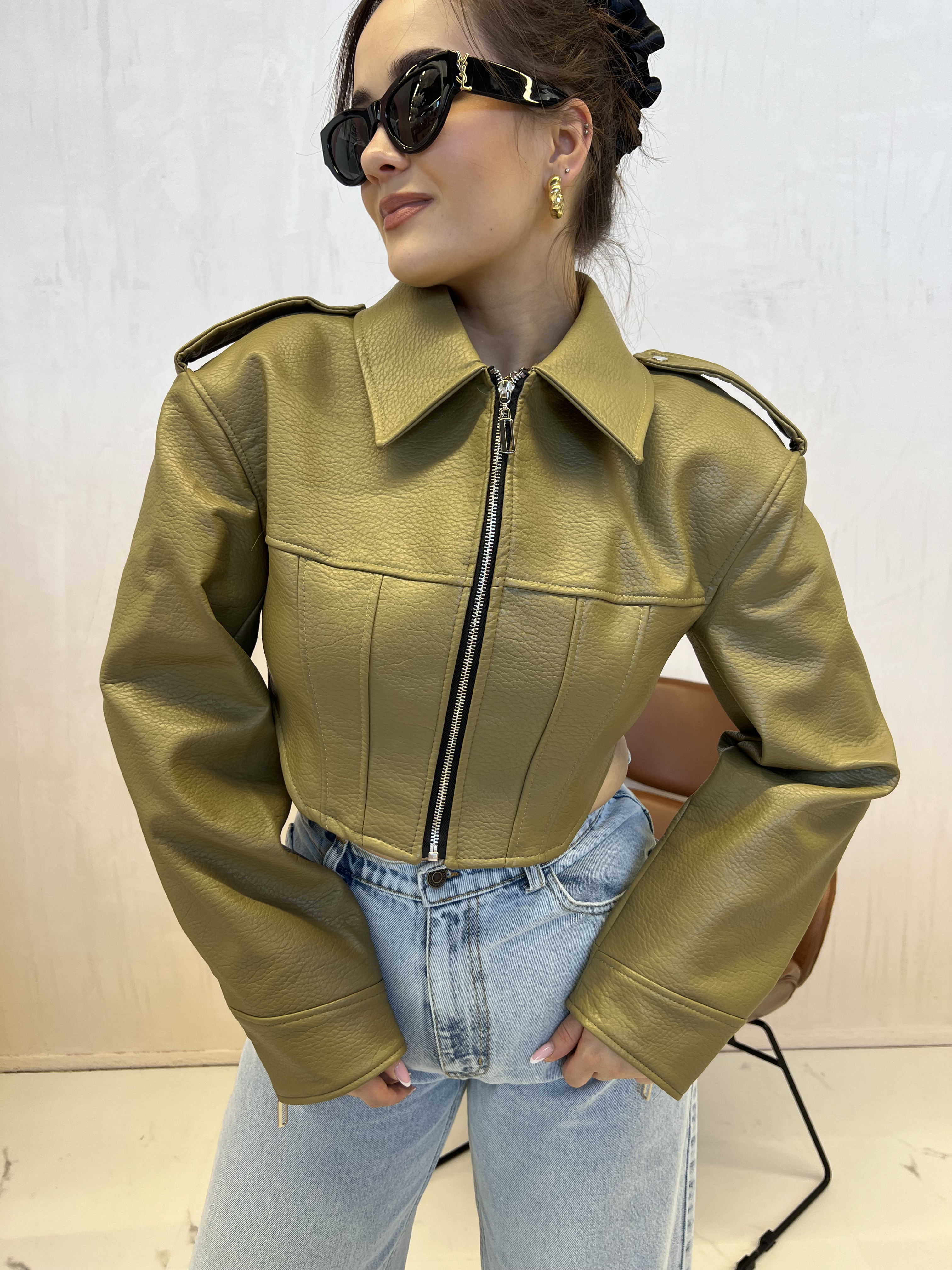 LA MILLA KRÓTKA KURTKA RAMONESKA SZNUROWANA ECO SKÓRA ZIELONY GROSZEK