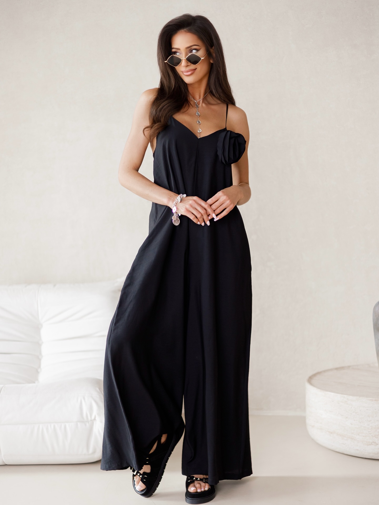 BY O LA LA...! LUŹNY KOMBINEZON Z KWIATEM CZARNY