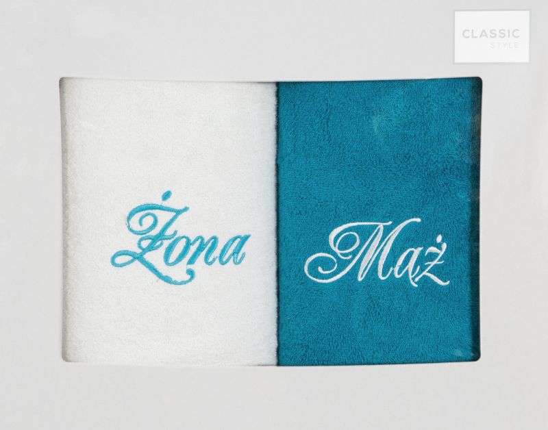 Komplet ręczników 2 szt. 70x140 Eurofirany Mąż-Żona biały turkusowy