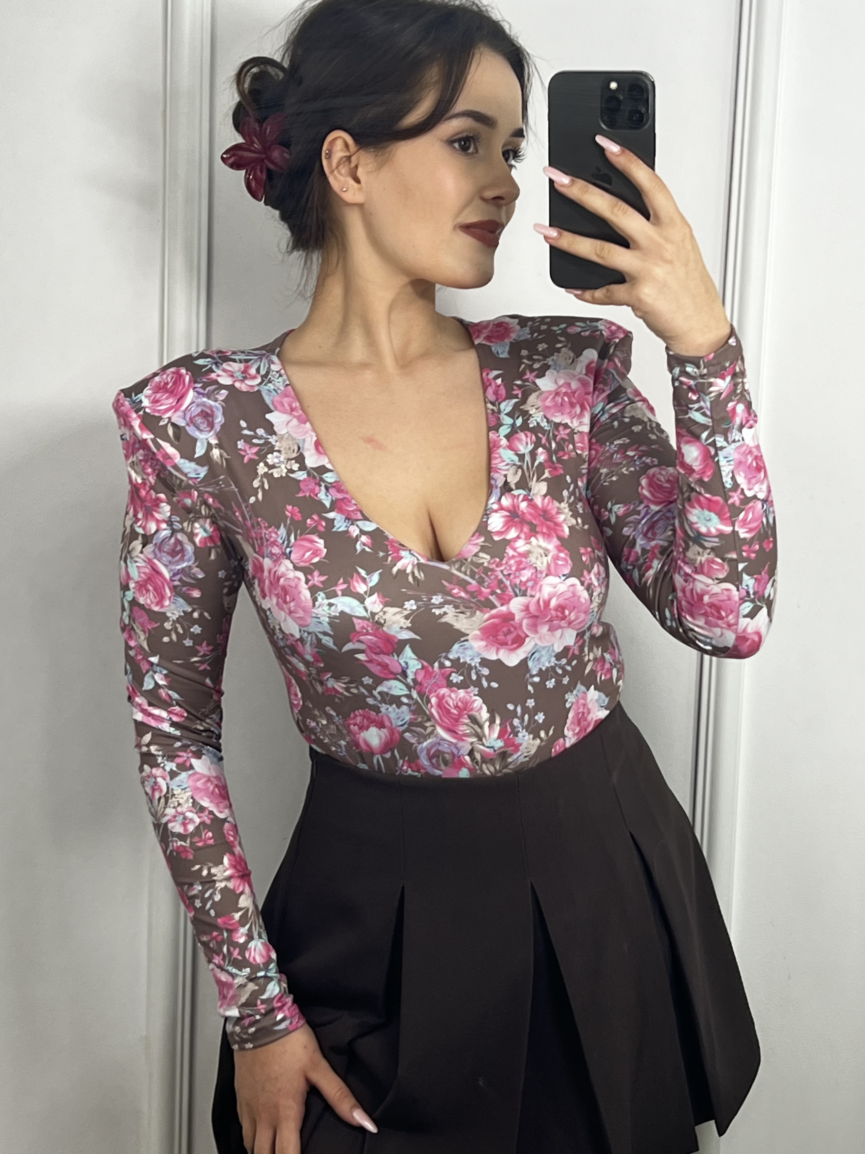 LA MILLA BAWEŁNIANE BODY V-NECK FLOWERS BRĄZ/RÓŻ/BŁĘKIT/BIEL