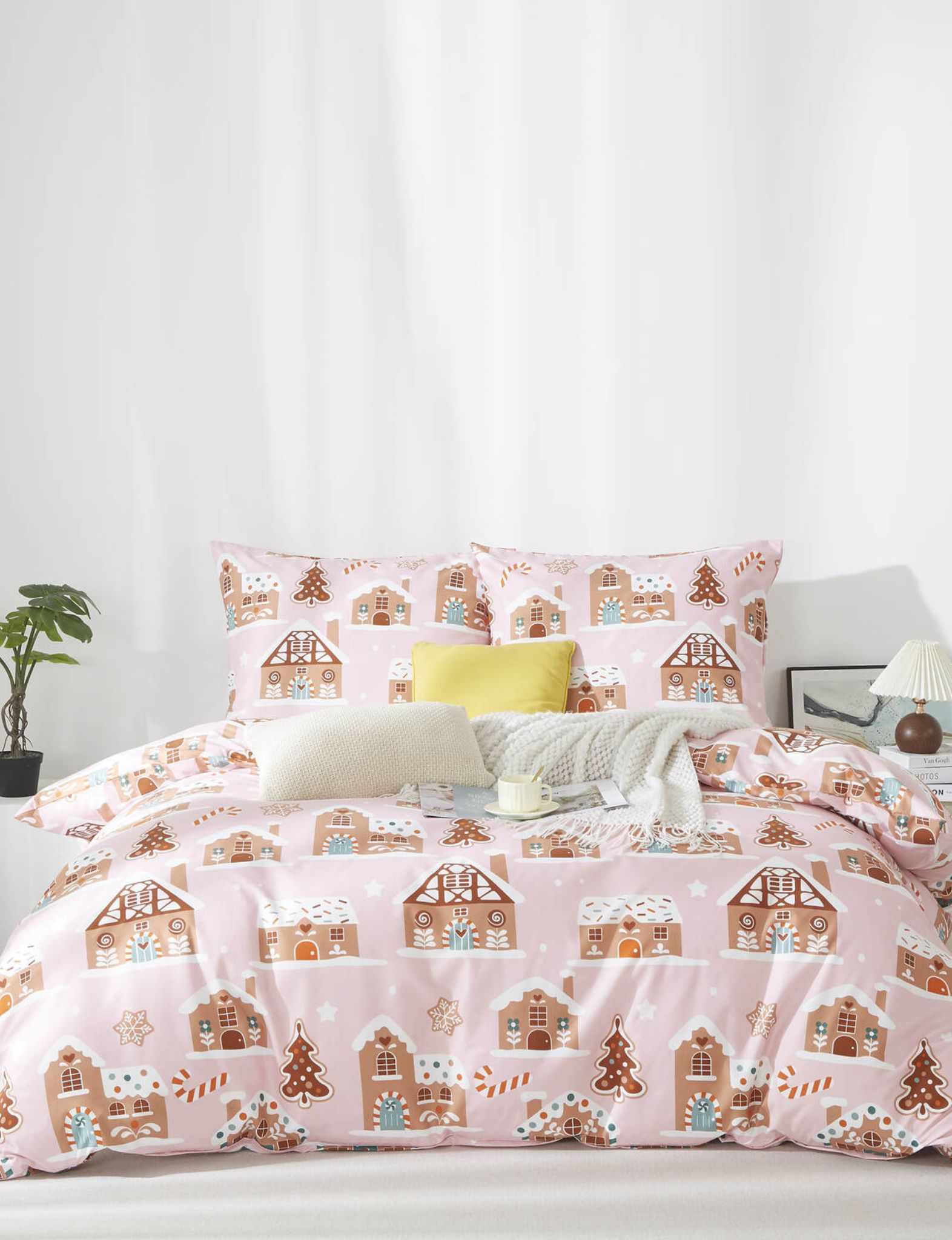 Pościel świąteczna Gingerhouse 140x200 pudrowa miodowa w domki z piernika