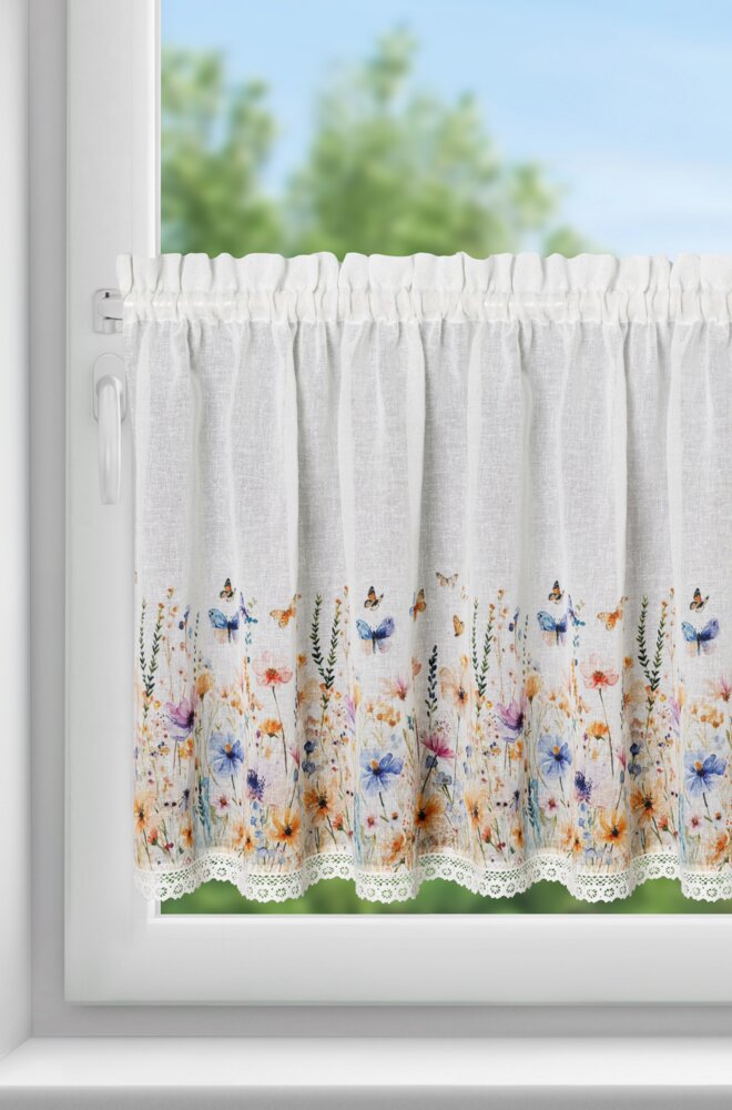 Firana gotowa zazdrostka ROZALIE 150x60 Eurofirany biała żółta niebieska fioletowa kwiaty motyle ko