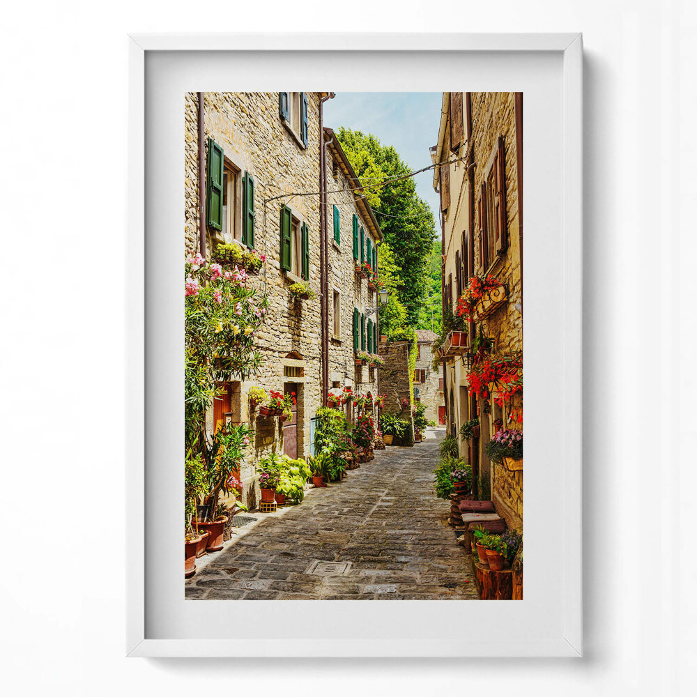 Függőleges kép keretben Szűk virágokkal díszített utcácska 50x70 cm Fehér