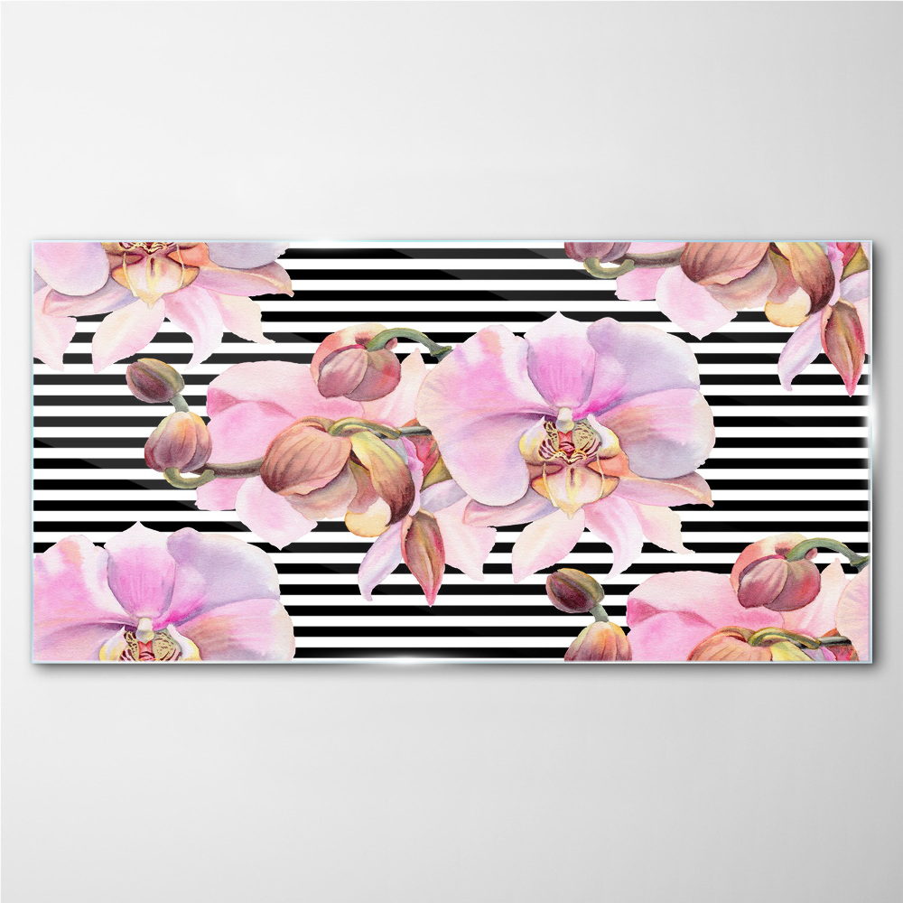 Tablou sticla Orhidee pe un fundal de dungi negre