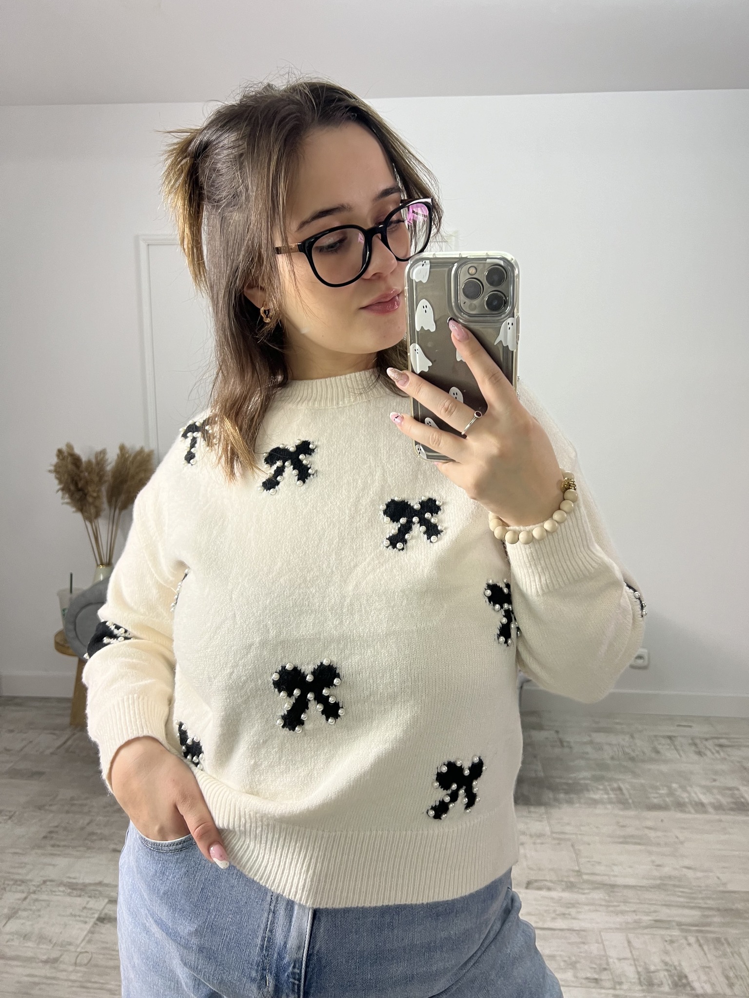 SWETER Z KOKARDKAMI ŚMIETANA