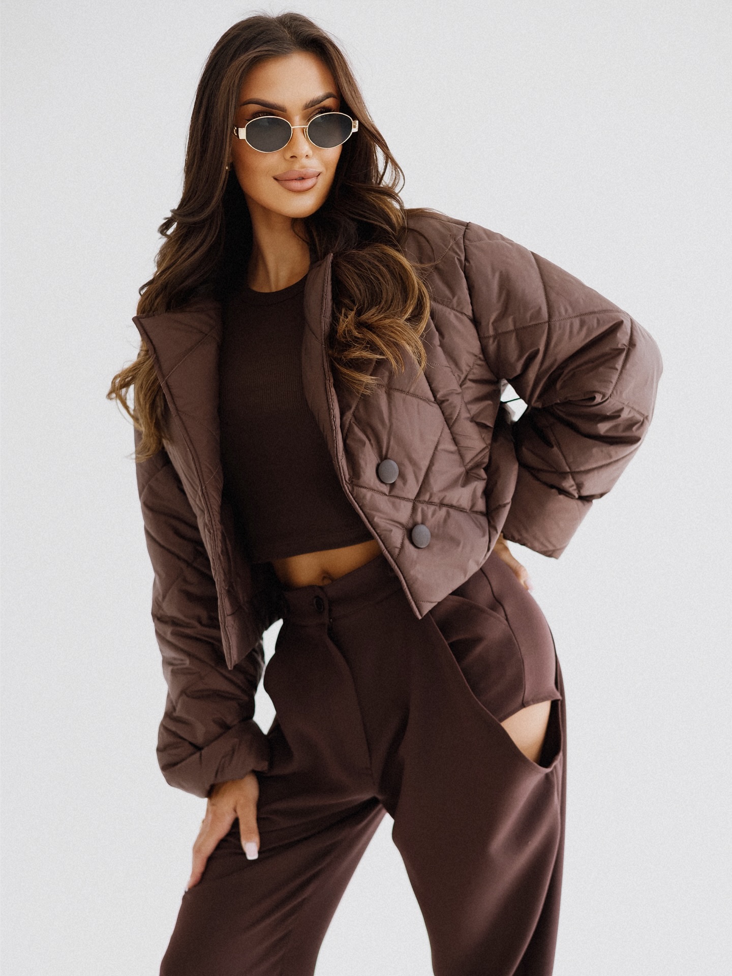 BY O LA LA! KRÓTKA PIKOWANA KURTKA Z KOŁNIERZYKIEM CHOCOMUS (CZEKOLADA)