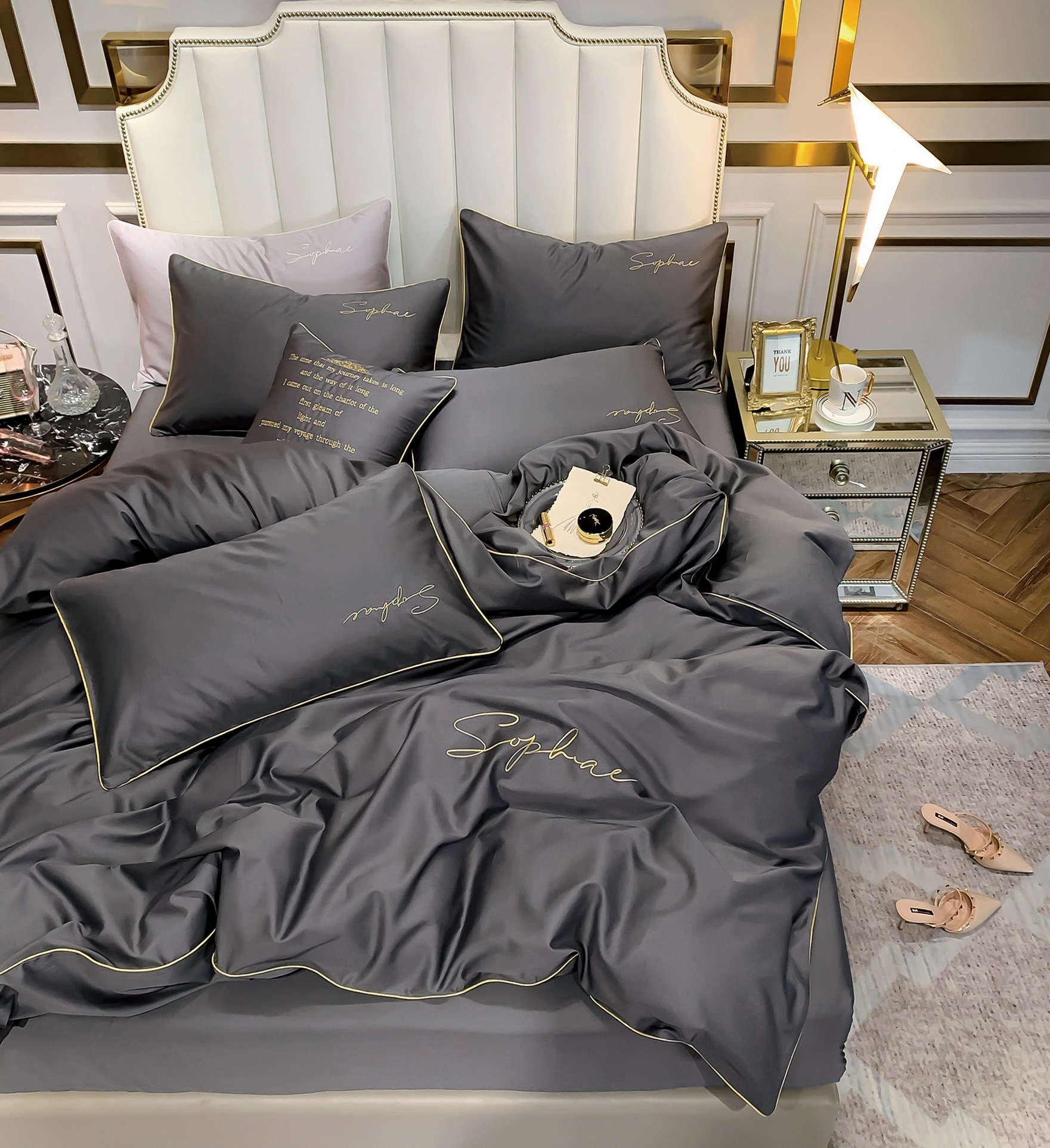 Pościel 160x200 grafitowa złoty haft satynowa lamówka