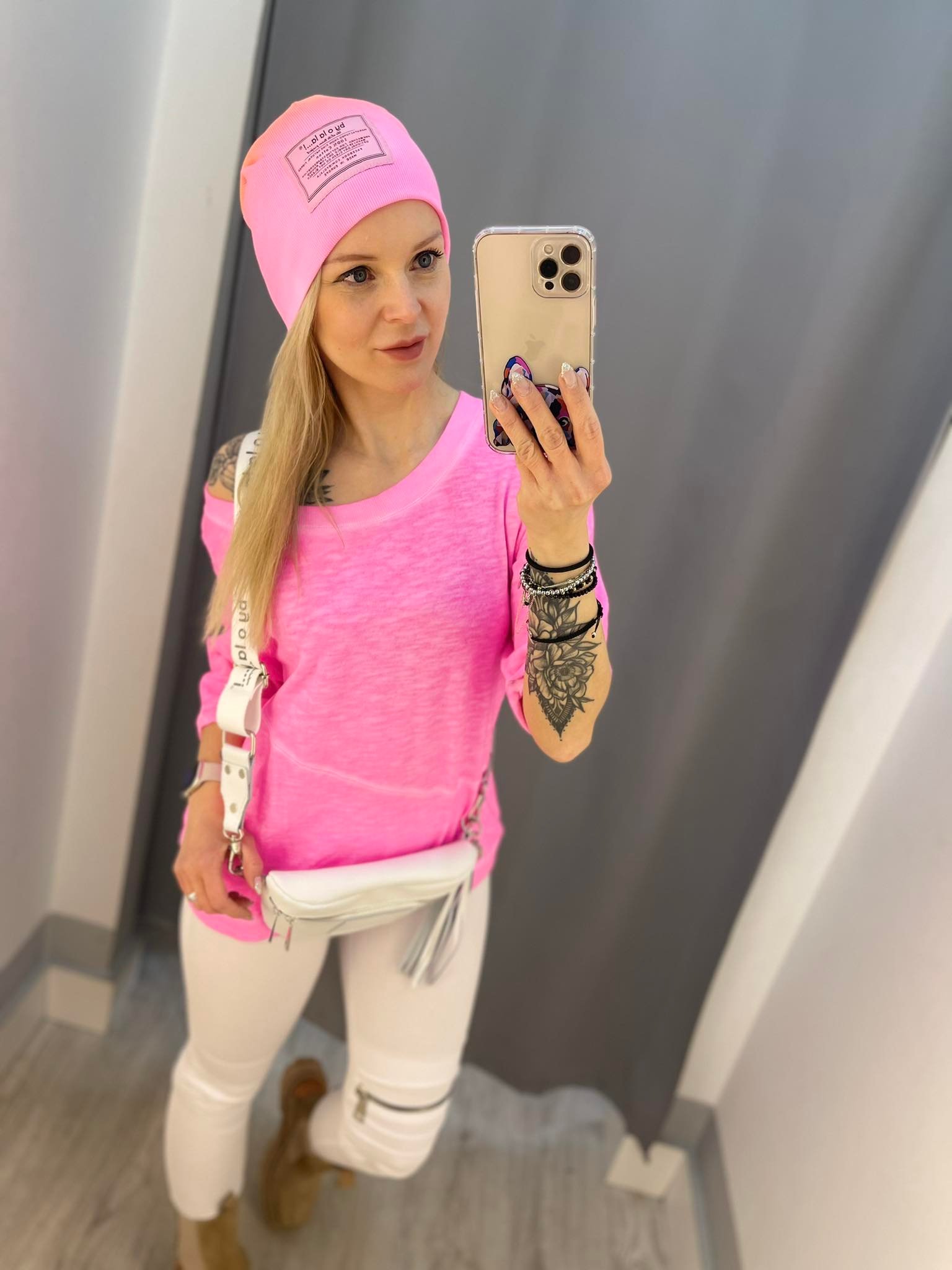 BY O LA LA...! FARBOWANA BLUZKA BASIC Z WYCIĘCIEM FLUO RÓŻ