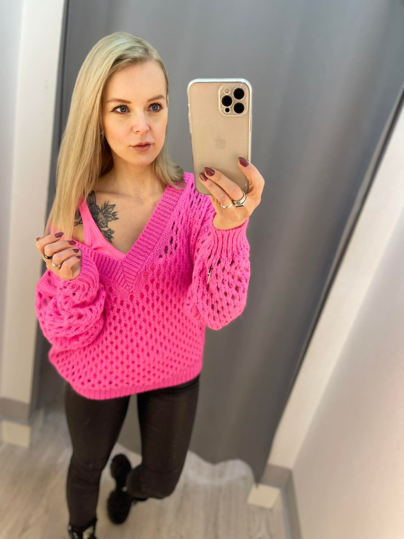 BY O LA LA! AŻUROWY SWETER V-NECK RÓŻ
