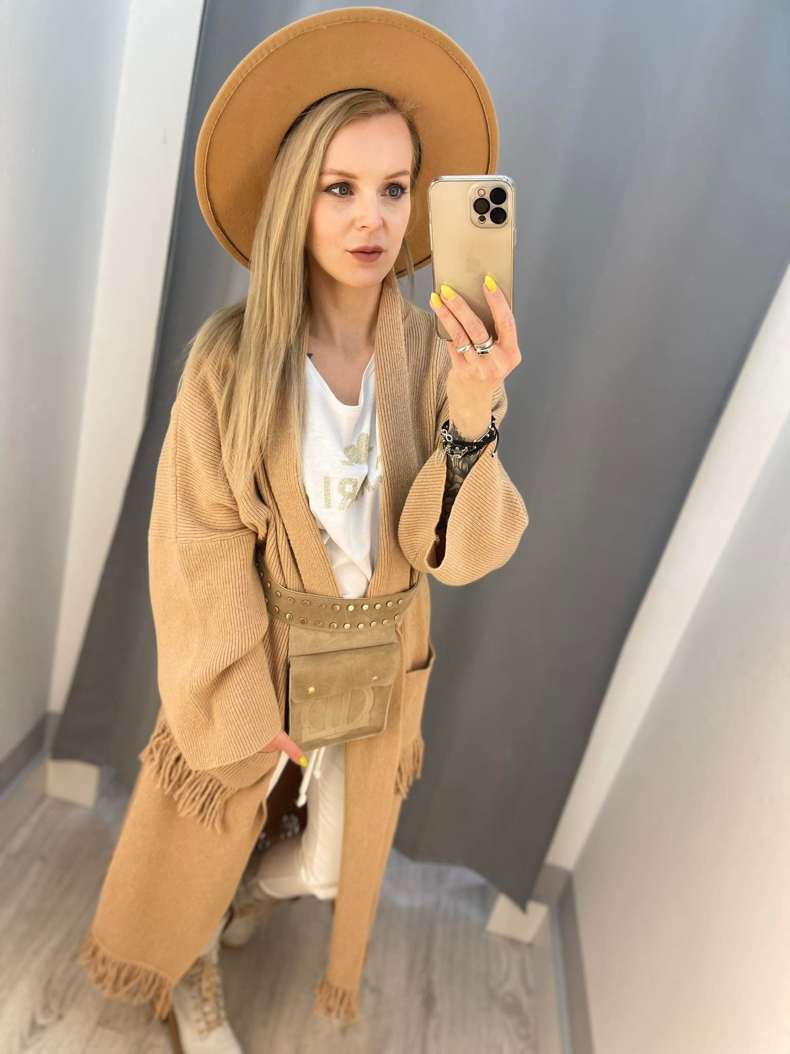 BY O LA LA...! PRĄŻKOWANY KARDIGAN Z FRĘDZLAMI AVA BEŻ