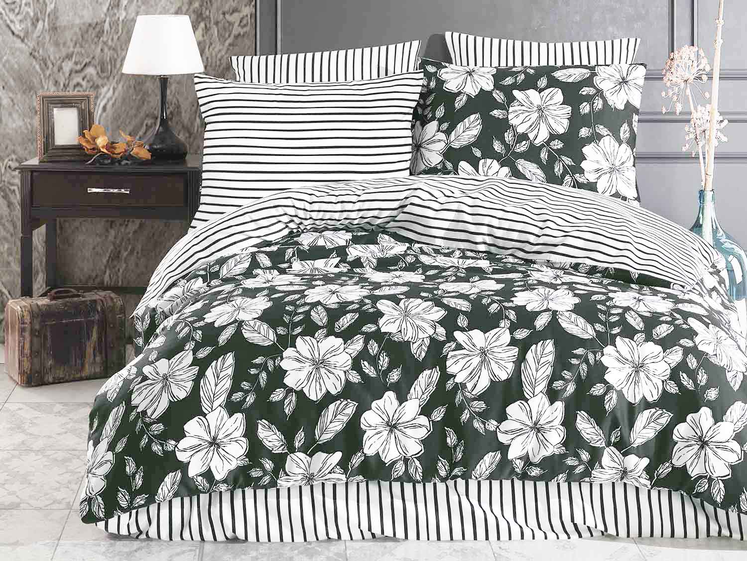 Pościel satyna bawełniana HAKKI GREEN 160x200 EXCLUSIVE biała zielona kwiaty paski
