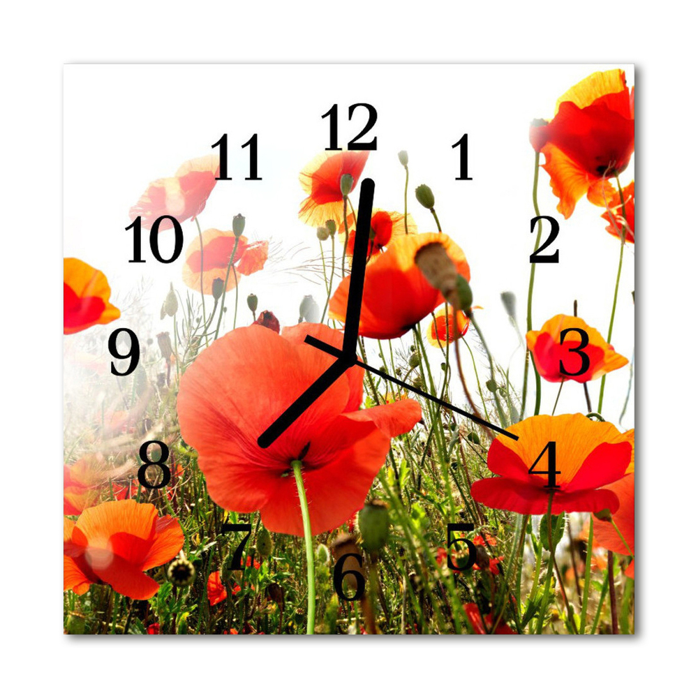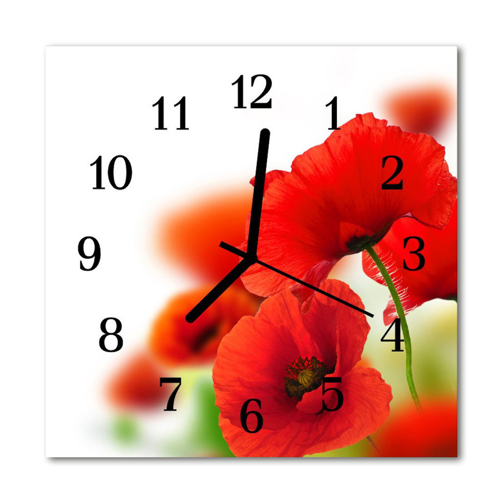 Ceas de perete din sticla pătrat Maci Flori & Plante Red 30x30 cm