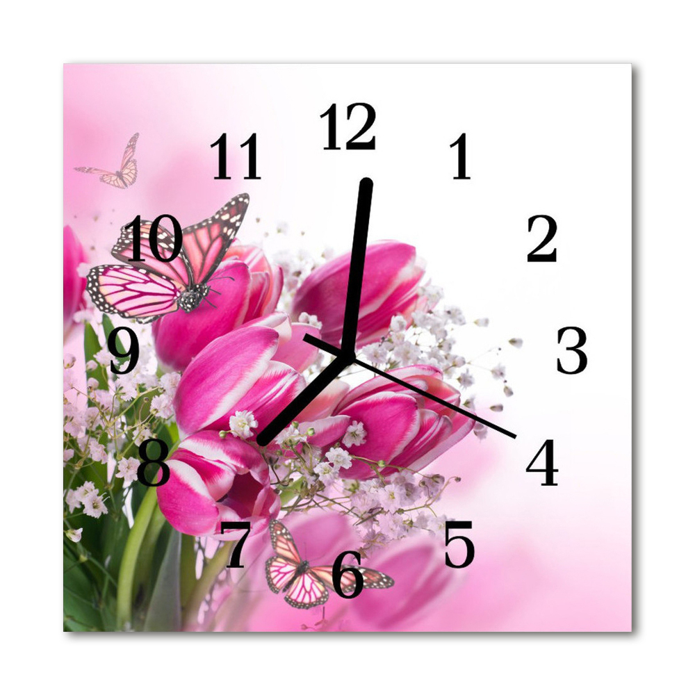 Ceas de perete din sticla pătrat Fluture roz Animale 30x30 cm