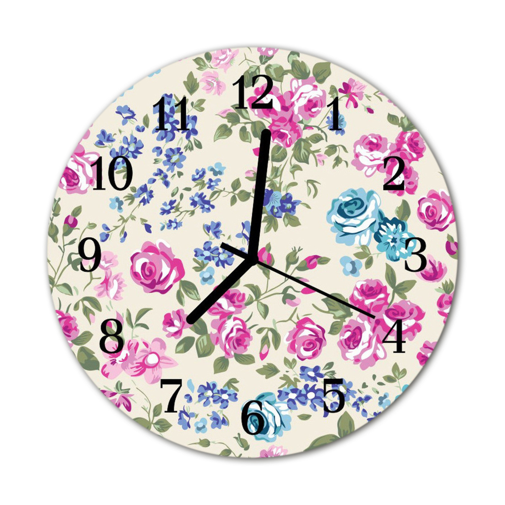Ceas de perete din sticla rotund Trandafiri flori albastre, roz fi 30 cm Negru