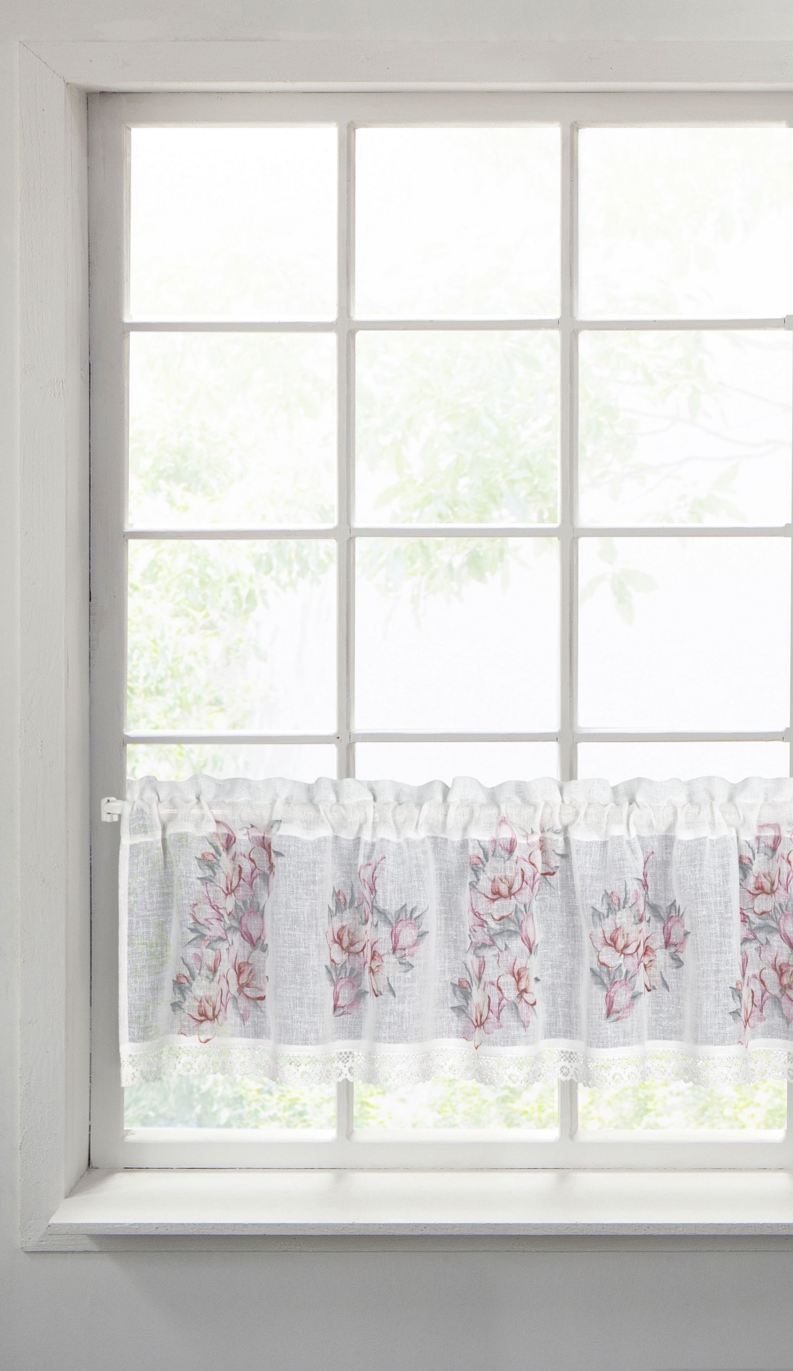 Firana gotowa zazdrostka SUZY 150x30 Eurofirany biała różowa szara kwitnące magnolie