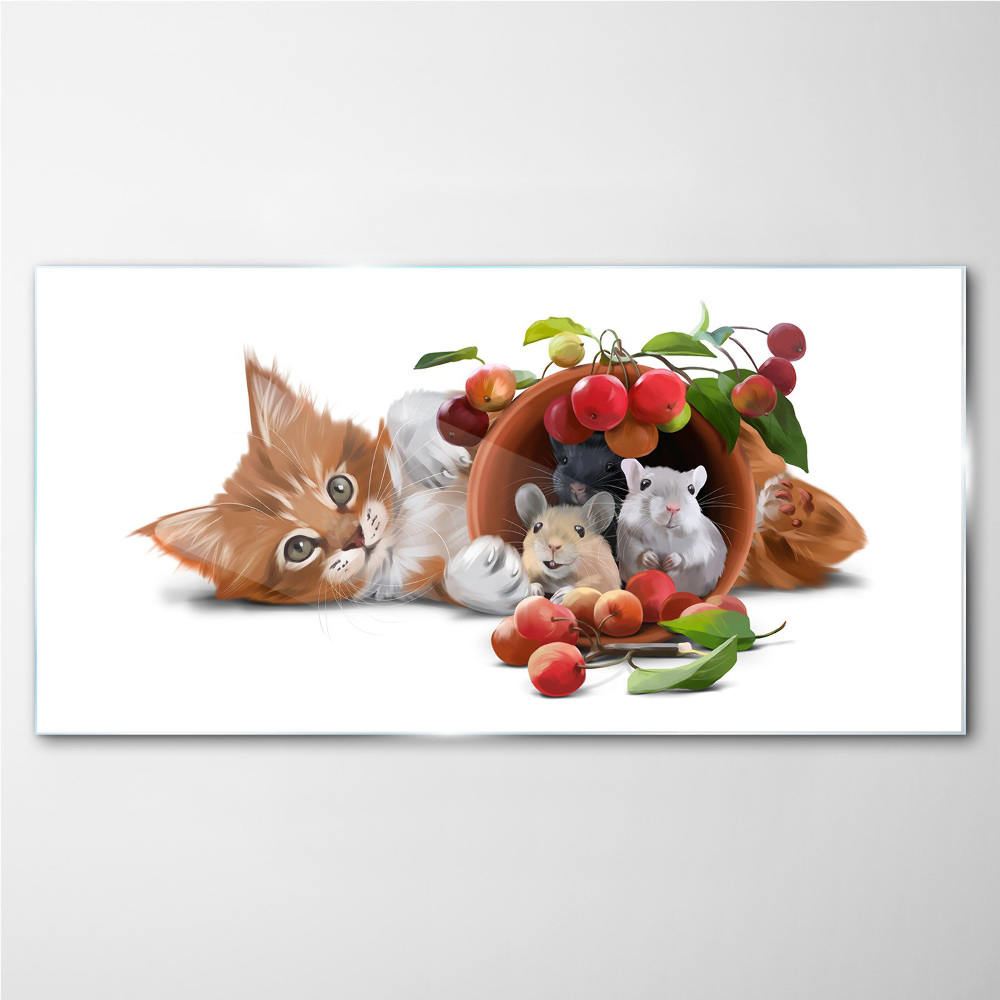 Glasbild Katze mit Mäusen und Früchten 100x50 cm