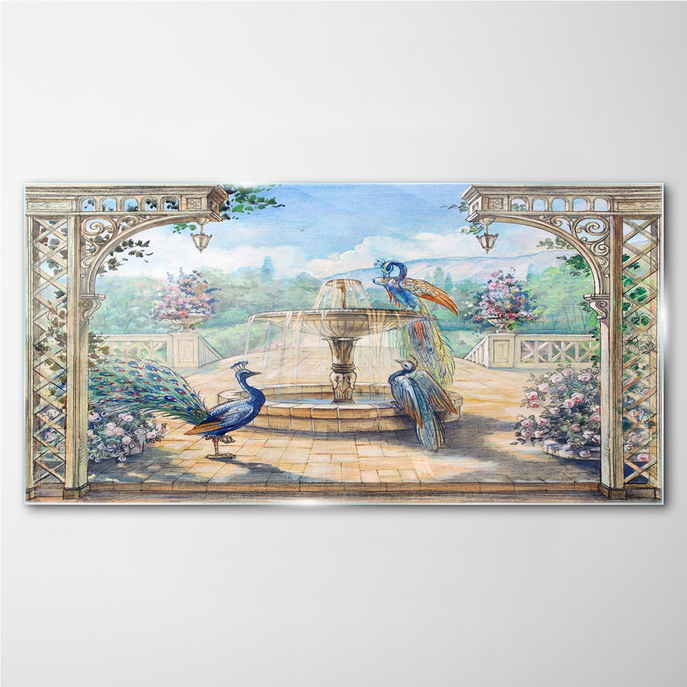 Obraz Szklany Pejzaż z pawiem i fontanną 100x50 cm
