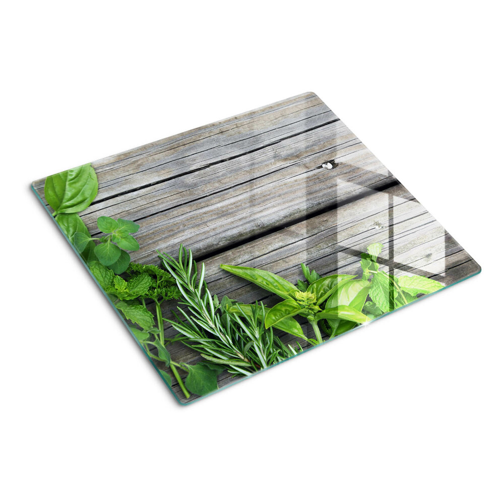 Tabla de cortar de cristal Hierbas verdes sobre fondo de madera 60x52 cm