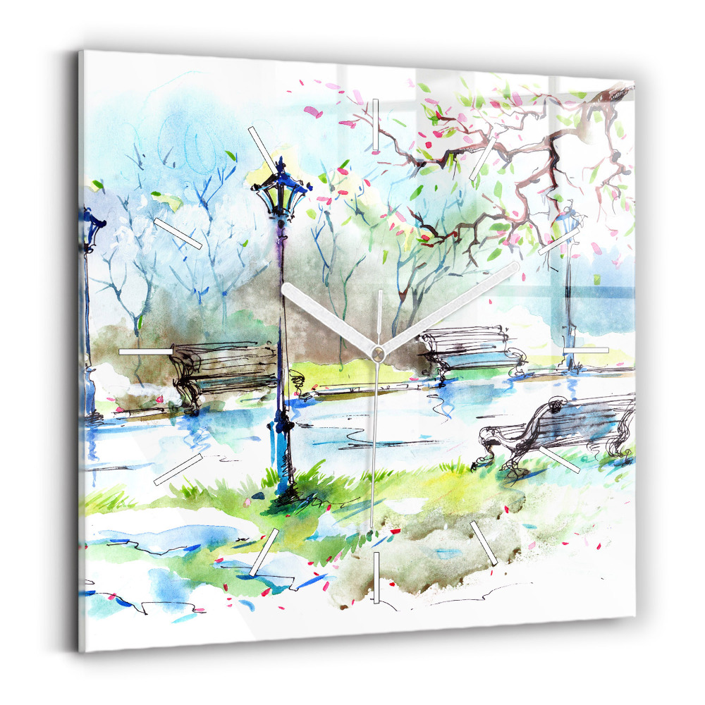 Ceas pătrat de perete din sticlă Primavara pitoreasca Linii Alb