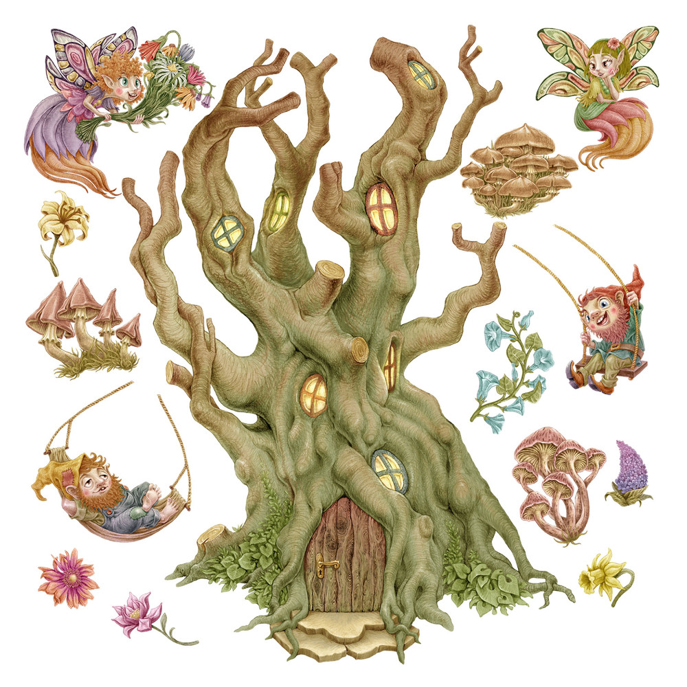 Wandtattoo 80x106 Waldfeenwesen und ein Baumhaus 80 cm